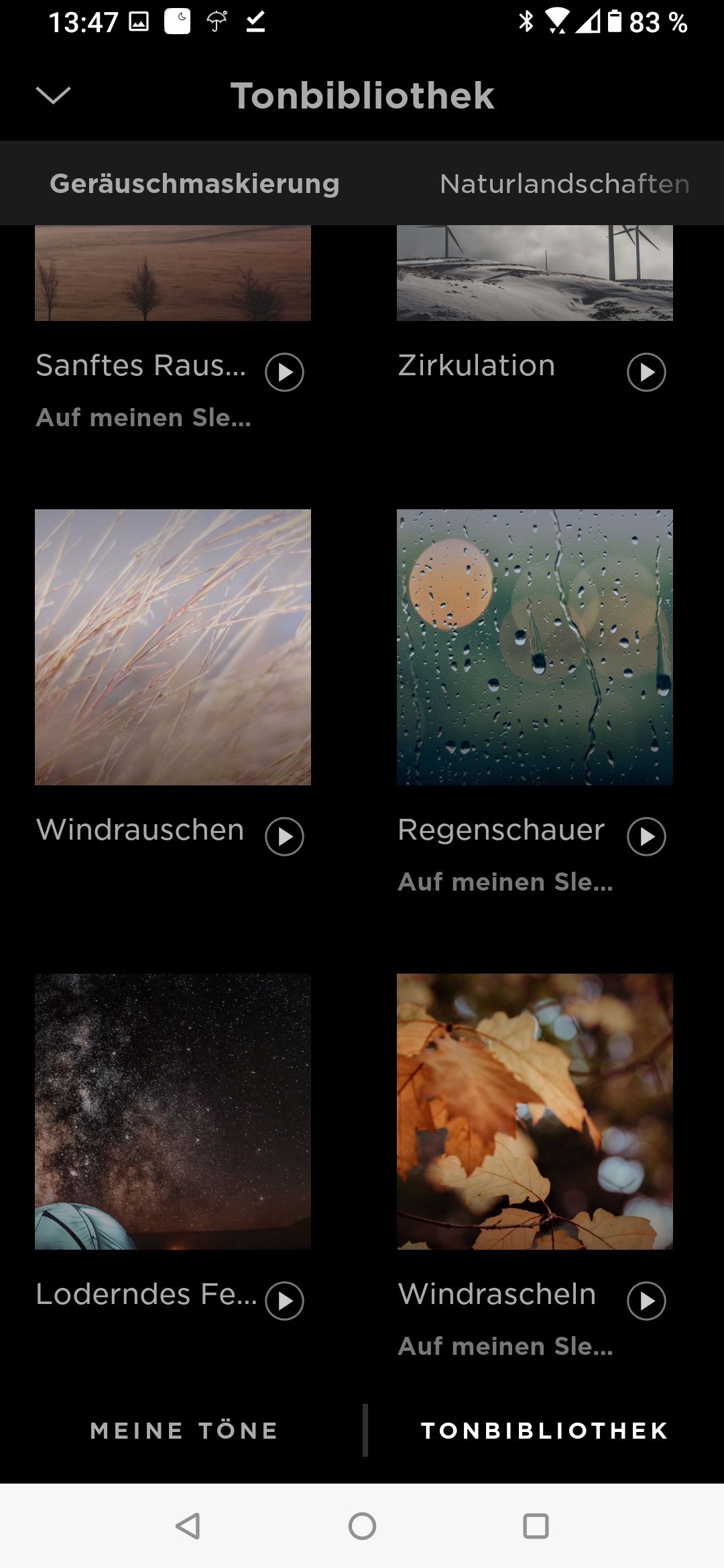 Es gibt einige dutzend verschiedene „Klang-Kulissen“ von Meeresrauschen über Bootsfahrten, Wälder, Lagerfeuer, goldene Träume etc. um nur einige zu nennen.